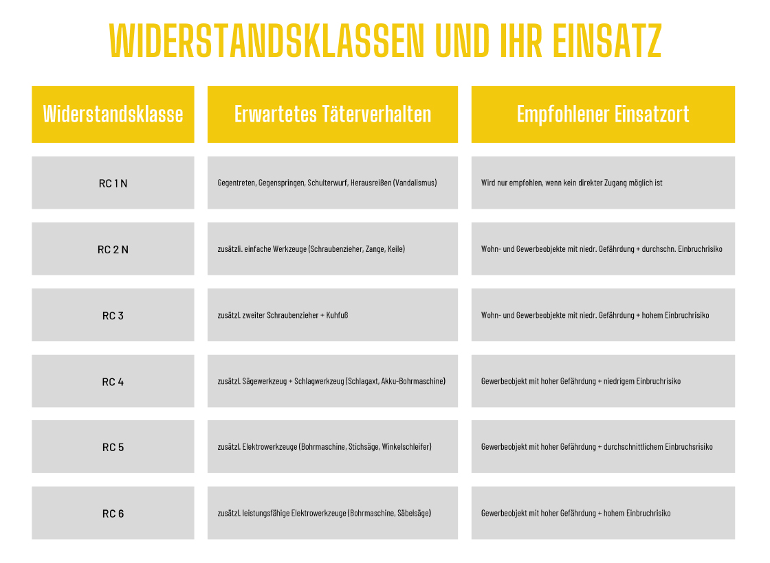 Einbruchhemmende Türen werden gemäß DIN EN 1627 in verschiedene Klassen eingeteilt, je nachdem, wie widerstandsfähig sie gegen Einbrüche sind. Die Norm klassifiziert die Widerstandsfähigkeit der Türen gegen unterschiedliche Einbruchmethoden und -werkzeuge. Die Klassen reichen von RC1 N (Grundschutz) bis RC6 (hoher Schutz gegen leistungsfähige Elektrowerkzeuge). Die Klassifikationen von Türen nach DIN EN 1627 sowie die Norm DIN 18251 für Einsteckschlösser helfen Ihnen, die passende Sicherheitstür für Ihre Bedürfnisse auszuwählen.