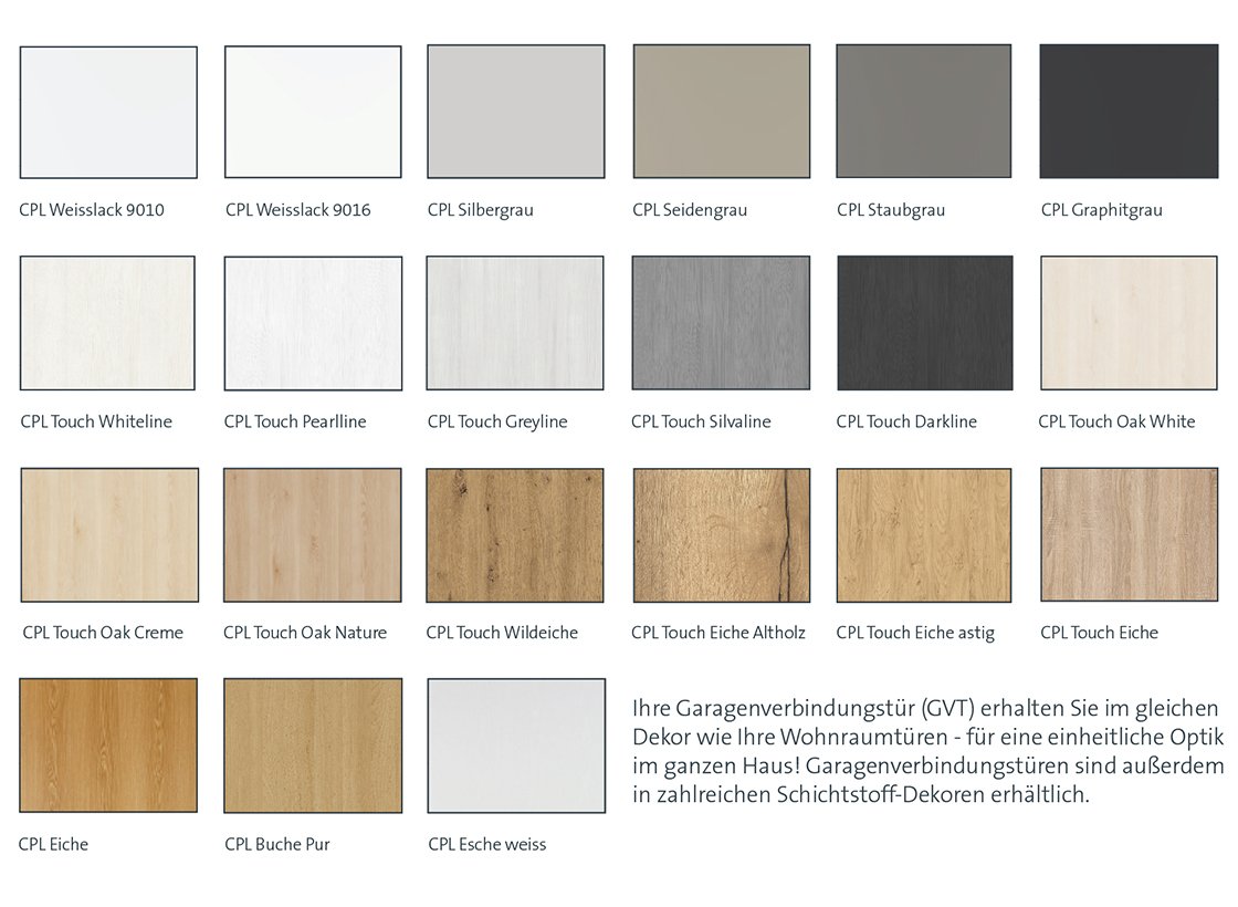 Mit SÜHAC Garagenverbindungstüren können Sie das Design Ihrer Innentüren nahtlos auf die Tür zur Garage übertragen. Die Türen sind in zahlreichen Dekoren erhältlich – von klassischen CPL Holzoptiken bis hin zu modernen Schichtstoff-Oberflächen.